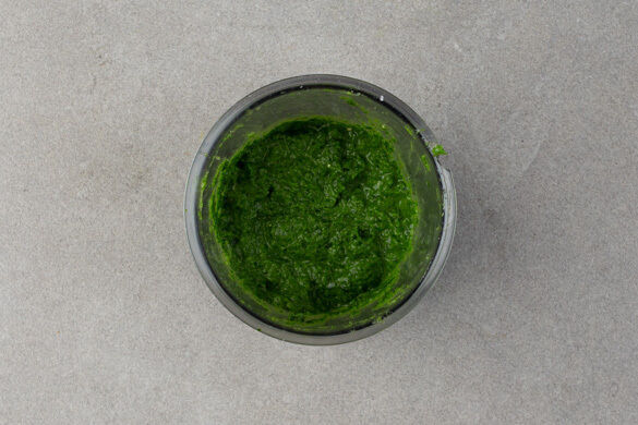 Den Käse fein reiben. Die Petersilie samt Stängeln grob hacken. Den Spinat mit dem Käse, ca. ¾ der Petersilie, 2EL Olivenöl, 1TL Essig, 4–5EL Wasser und ½TL Salz in einem hohen Gefäß zu einem glatten Pesto pürieren. Mit Salz und Pfeffer abschmecken.