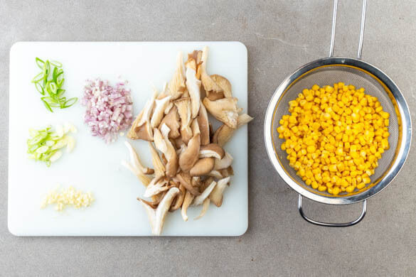Den weißen Teil und den grünen Teil der Lauchzwiebeln getrennt in feine Ringe schneiden. Die Schalotten schälen und fein würfeln. Den Knoblauch schälen und durch eine Knoblauchpresse drücken oder sehr fein würfeln. Den Mais in ein Sieb abgießen und abtropfen lassen.