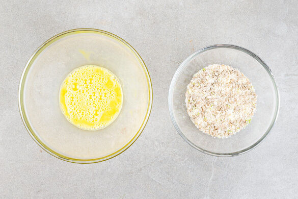 Den Backofen auf 240°C (220°C Umluft) vorheizen. 2EL Olivenöl auf ein mit Backpapier ausgelegtes Backblech träufeln und in den Ofen schieben. Die Limettenschale abreiben und die Limette auspressen. 1 Ei mit 1EL Wasser sowie je 1 Prise Salz und Pfeffer verquirlen. Den Käse fein reiben und mit der ½ der Semmelbrösel, den Sonnenblumenkernen und der Limettenschale vermengen.