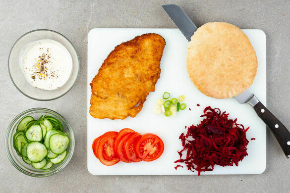 Die Levante ist ein kulturelles und kulinarisches Paradies! Das weiß auch unsere Köchin Elisabeth, die auf einem ihrer kulinarischen Streifzüge durch die kleinen Gassen von Tel Aviv zu dieser Kreation inspiriert wurde. Wenn Pitabrot und zitroniges Tahinidressing auf ein klassisch knuspriges Bio-Hähnchenschnitzel, geraspelte Rote Bete und süß-sauer eingelegte Gurken treffen, dann ist die interkulturelle Kommunikation geglückt.