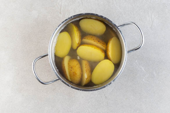 In einem mittelgroßen Topf ausreichend gesalzenes Wasser für die Kartoffeln zum Kochen bringen. Die Kartoffeln samt Schale je nach Größe längs halbieren oder vierteln. In das kochende Wasser geben und 15–20Min. kochen lassen, bis die Kartoffeln gar sind. Dann in ein Sieb abgießen und abkühlen lassen.