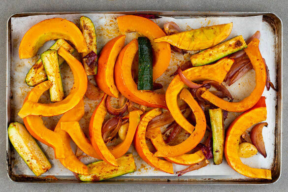 Den Kürbis, die Zucchini, die Zwiebeln und den Knoblauch auf zwei mit Backpapier ausgelegte Backbleche verteilen und jeweils mit 1EL Olivenöl, der Gewürzmischung und ½TL Salz vermengen. Gleichmäßig verteilen und ca. 10Min. im Ofen rösten.