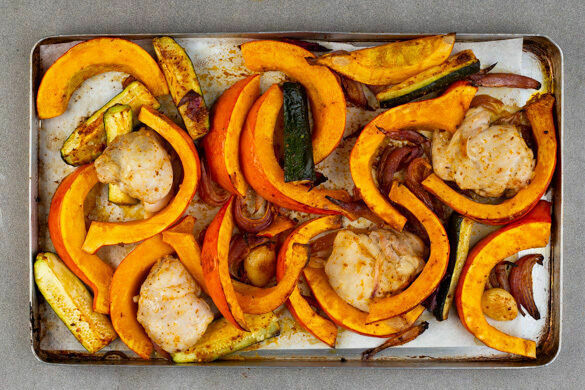 Der Duft von aromatischen Gewürzen strömt heute aus deiner Küche, denn du röstest Kürbis, Zucchini und Zwiebeln in einer feinen Mischung aus u. a. Kurkuma, Zimt und Gewürznelke. Und weil wir es unkompliziert mögen, darf das zarte Bio-Hähnchenfilet gleich mit auf das Backblech. Eine schnelle Joghurtsauce mit Tahini dazu – das ist Low Carb mit viel Genuss!