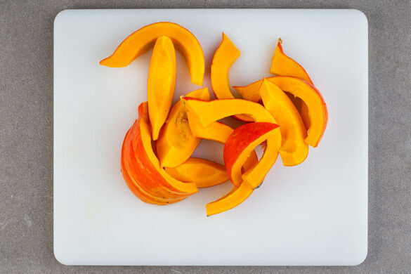 Den Backofen auf 240°C (220°C Umluft) vorheizen. Den Kürbis halbieren, entkernen und in ca. 2cm dicke Spalten schneiden.