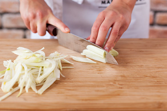 Backofen auf 160°C Umluft vorheizen. Fenchel waschen, Strunk ausschneiden und in möglichst dünne Streifen schneiden. Wer einen Gemüsehobel besitzt, kann den Fenchel einfach fein hobeln.