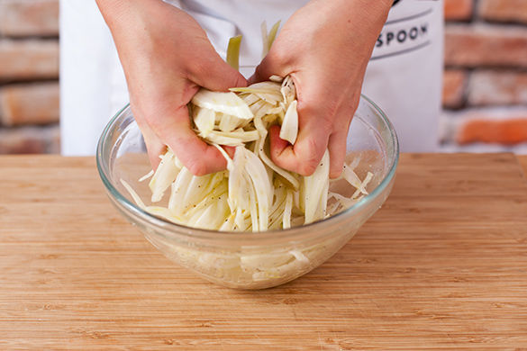 Fenchel in eine Schüssel geben, mit einer guten Prise Salz sowie Zucker und Rotweinessig marinieren. Beiseitestellen.