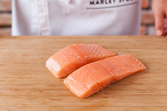 Lachs kalt abspülen, trocken tupfen und für einen Moment die Raumtemperatur annehmen lassen.