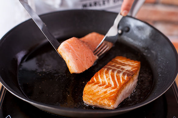 2EL Öl in einer mittelgroßen Pfanne auf mittlere Stufe erhitzen. Lachs ca. 1-2Min. pro Seite kross braten. Mit Salz und Pfeffer würzen und ca. 10-15Min., je nach Fischdicke, im Ofen fertig garen.
