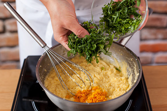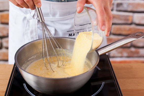 Milch sowie 200ml Wasser in einem mittelgroßen Kochtopf zum Kochen bringen, Brühwürfel darin auflösen. Polenta mit einem Schneebesen einrühren, und unter ständigem Rühren ca. 4Min. bissfest gar kochen.