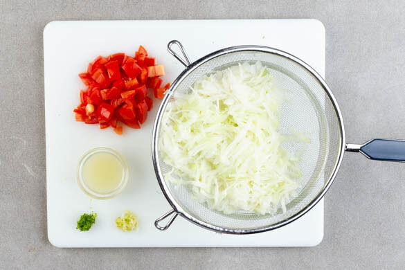 Den Kohlrabi schälen, grob raspeln und mit 1 kräftigen Prise Salz vermengen. In ein Sieb geben und zum Abtropfen beiseitestellen. Die Tomate grob würfeln. Die Limettenschale abreiben, dann die Limette halbieren und auspressen. Den Knoblauch schälen und fein reiben.