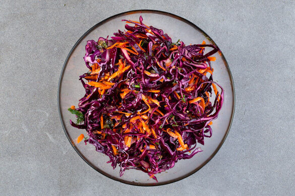 Die Karotte ggf. schälen und grob reiben. Die ½ des Rotkohls in dünne Streifen schneiden. Die Dillspitzen und -stängel separat grob schneiden. Die Karotten, den Rotkohl und die Dillspitzen in eine große Schüssel geben. Den Knoblauch schälen und grob würfeln. Die Zitronenschale abreiben, dann die Zitrone halbieren und eine Hälfte auspressen.