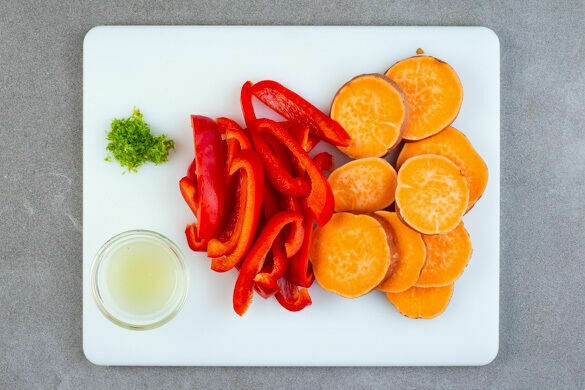 Den Backofen auf 240°C (220°C Umluft) vorheizen. Die Süßkartoffeln in 0,5cm dünne Scheiben schneiden. Die Paprika vierteln, entkernen und in 1–2cm breite Streifen schneiden. Die Limettenschalen abreiben, dann die Limetten halbieren und auspressen.