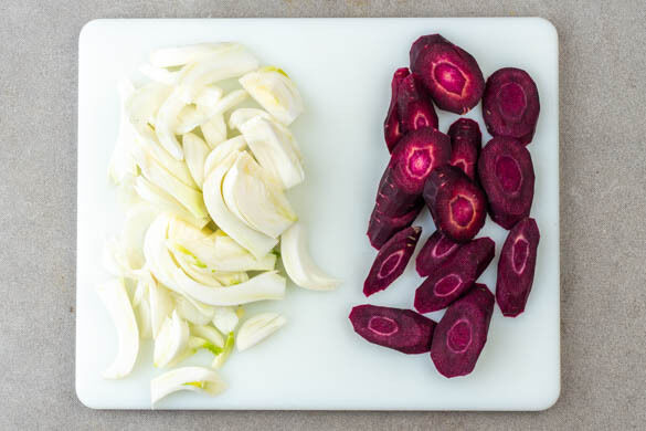 Den Backofen auf 240°C (220°C Umluft) vorheizen. Die Karotten ggf. schälen und schräg in 1–2cm breite Scheiben schneiden. Den Fenchel von den Stielen befreien, dann längs halbieren und der Länge nach in ca. 0,5cm breite Streifen schneiden.