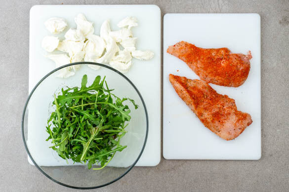 1EL Olivenöl, ½EL Balsamicoessig und je 1 Prise Salz und Pfeffer verrühren und den Rucola untermengen. Den Mozzarella in mundgerechte Stücke zupfen. Das Fleisch trocken tupfen, horizontal halbieren und rundum mit der ½ der Gewürzmischung und je 1 kräftigen Prise Salz und Pfeffer würzen.