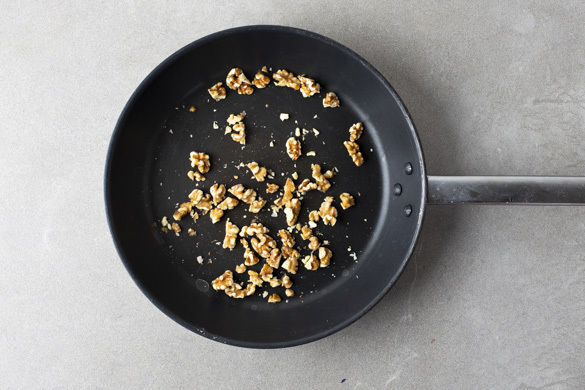 Die Walnüsse grob hacken und in einer großen Pfanne ohne Zugabe von Fett bei mittlerer Hitze 1–2Min. anrösten. Vorsicht, sie können schnell zu dunkel werden. Zum Abkühlen aus der Pfanne nehmen und beiseitestellen, die Pfanne aufbewahren.