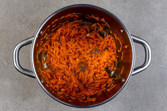 750ml Wasser in einem Wasserkocher aufkochen. Die Karotten ggf. schälen und grob raspeln. Die Knoblauchzehe schälen und fein würfeln. Die Karotten und die ½ des Knoblauchs in einem großen Topf mit 2EL Pflanzenöl bei mittlerer Hitze ca. 2Min. braten, dann die Gewürzmischung einrühren.