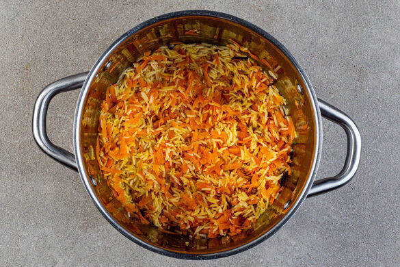 Den Reis in einem Sieb kalt abspülen, bis das Wasser klar bleibt. Den Reis, das aufgekochte Wasser und 1TL Salz zu den Karotten in den Topf geben und abgedeckt bei niedrigster Hitze 12–14Min. kochen, bis das Wasser aufgesogen und der Reis gar ist. Noch ca. 5Min. ohne Hitzezufuhr ziehen lassen.