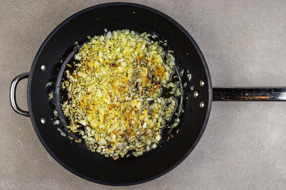 Die Zwiebel schälen, halbieren und fein würfeln. Die Zwiebelwürfel in einer mittelgroßen Pfanne mit 1EL Olivenöl bei mittlerer bis niedriger Hitze glasig anschwitzen, dabei gelegentlich umrühren.