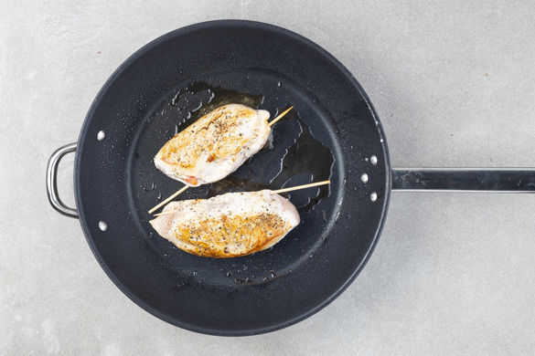 Die Hähnchentaschen mit Salz und Pfeffer würzen und in einer großen, ofenfesten Pfanne mit 2EL Olivenöl bei mittlerer Hitze auf jeder Seite 1–2Min. anbraten. Anschließend 9–12Min. im Ofen weitergaren, bis das Fleisch in der Mitte durch ist. Tipp: Wer keine ofenfeste Pfanne hat, kann das Fleisch nach dem Anbraten in eine Auflaufform geben.