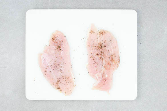 Das Fleisch trocken tupfen und jeweils horizontal zu 2 dünnen Schnitzeln halbieren. Mit einem Fleischklopfer oder einer schweren Pfanne ca. 1cm dünn plattieren und von beiden Seiten mit Salz und Pfeffer würzen.