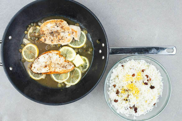 Italien trifft Asien, wenn es sich das zarte Bio-Hähnchenschnitzel auf lockerem Basmatireis bequem macht. Die leckere Zucchinipfanne, Kapern und gebratene Zitronenscheiben – die du, wenn du magst, auch mitessen kannst – bringen mediterrane Aromen ins Spiel, Datteln eine feine Süße. Buon appetito!