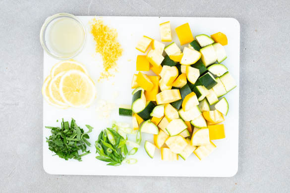 Die Zucchini längs vierteln und in ca. 1cm breite Stücke schneiden. Die Lauchzwiebel schräg in dünne Ringe schneiden. Den Knoblauch schälen und in dünne Scheibchen schneiden. Die Zitronenschale abreiben und die Zitrone halbieren, eine Hälfte auspressen, die andere Hälfte in dünne Scheiben schneiden. Die Basilikumblätter abzupfen und fein schneiden.