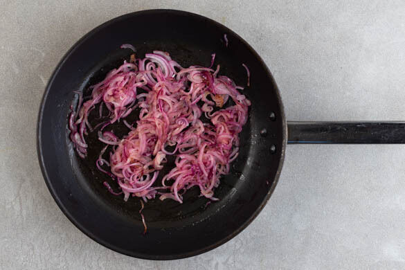 Die Zwiebeln schälen, halbieren und in dünne Streifen schneiden. Die Zwiebelstreifen in einer mitelgroßen Pfanne mit 2EL Olivenöl und 1 kräftigen Prise Salz bei mittlerer bis niedriger Hitze unter gelegentlichem Rühren ca. 4Min. glasig anbraten, ohne sie zu bräunen.