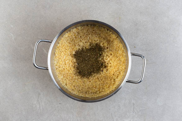 In einem kleinen Topf 300ml leicht gesalzenes Wasser zum Kochen bringen. Den Bulgur in das kochende Wasser rühren und abgedeckt bei niedriger Hitze 5–7Min. sanft köcheln lassen, bis das Wasser aufgesaugt und der Bulgur gar ist. Den Topf vom Herd nehmen und die ½ der getrockneten Minze unterheben. Den Bulgur abgedeckt warm halten.