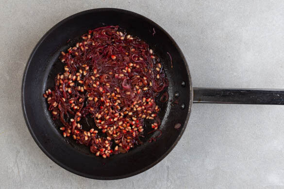 Die ½ der Granatapfelkerne zu den Zwiebeln in die Pfanne geben und ca. 4Min. weiter braten. 2EL Balsamicoessig und ½TL Honig hinzufügen und bei starker Hitze ca. 1Min. köcheln lassen, bis eine klebrige Zwiebelmarmelade entsteht.