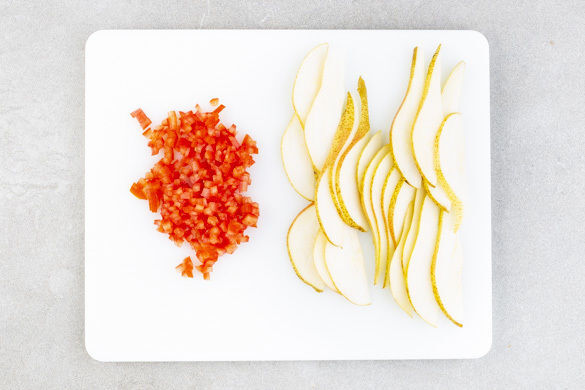 Den Backofen auf 230°C (210°C Umluft) vorheizen. Die Birne vierteln, den Strunk und das Kerngehäuse entfernen, dann der Länge nach in ca. 0,5cm dünne Scheiben schneiden. Die Tomate vierteln, entkernen und in sehr kleine Würfel schneiden.