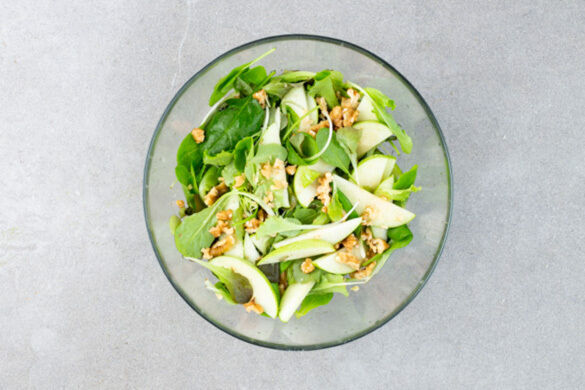 Den Apfel vierteln, entkernen und in dünne Scheiben schneiden. Die Walnüsse grob hacken.