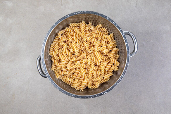 In einem großen Topf ausreichend gesalzenes Wasser für die Pasta zum Kochen bringen. Die Pasta in das kochende Wasser geben und in 7–9Min. bissfest kochen. In ein Sieb abgießen und abtropfen lassen.