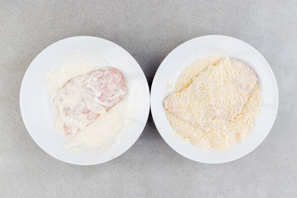 6EL Mehl mit 120ml Wasser zu einem dickflüssigen Teig verarbeiten und auf einen tiefen Teller geben. Auf einem weiteren Teller das Panko-Paniermehl bereitstellen. Das Fleisch trocken tupfen und horizontal halbieren. Die Schnitzel im Teig wenden und ggf. abtropfen lassen, dann im Panko-Paniermehl wenden.