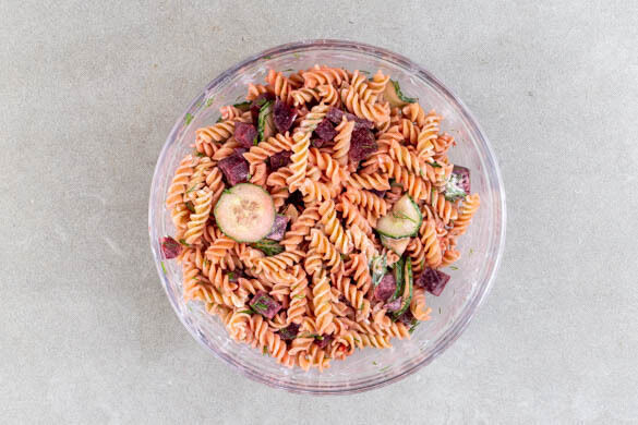 Die Pasta mit den Gurken, der Roten Bete samt Flüssigkeit, ⅔ des Dills und 4EL Mayonnaise vermengen, nach Geschmack mit Salz würzen. Die Pasta mit dem restlichen Dill garnieren und zu den Schnitzeln servieren, die Zitronenspalten dazu reichen.