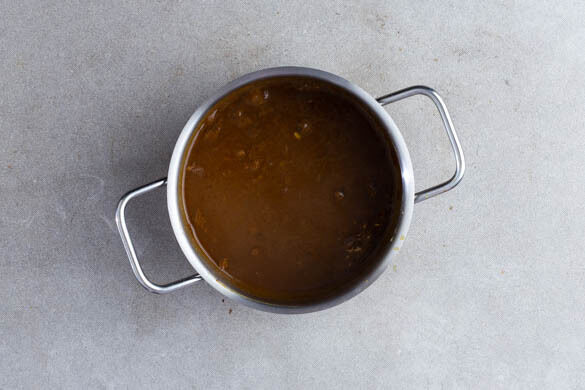 In einem kleinen Topf 1EL Pflanzenöl bei mittlerer Hitze erwärmen. Den Knoblauch und 1EL Mehl unterrühren und 30Sek.–1Min. anschwitzen. Dann die Würzsauce, 200ml Wasser, die ½ des Brühgewürzes und die ½ des Currypulvers einrühren und die Sauce 5–6Min. auf niedriger Hitze sanft köcheln lassen.