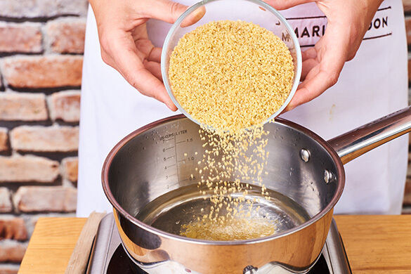 Den Bulgur in das kochende Wasser rühren und abgedeckt bei niedriger Hitze 5–7Min. sanft köcheln lassen, bis das Wasser aufgesaugt und der Bulgur gar ist. Noch ca. 5Min. ohne Hitzezufuhr ziehen lassen.