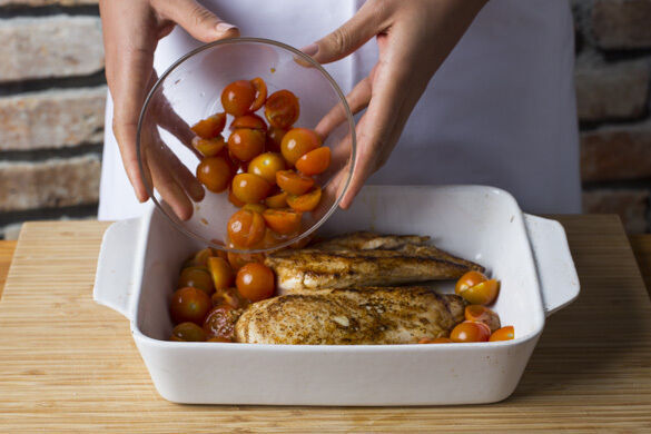Das Fleisch in einer mittelgroßen Pfanne mit 2TL Olivenöl bei mittlerer Hitze auf jeder Seite 2–3Min. goldbraun anbraten. In eine Auflaufform geben, die Kirschtomaten um das Fleisch verteilen und alles 8–10Min. im Ofen backen, bis das Fleisch gar ist.