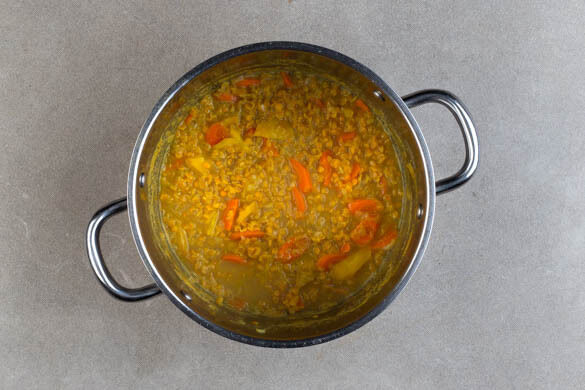 Die Gewürzmischungen unter die Karotten mengen. Die Linsen in einem Sieb mit kaltem Wasser abspülen, dann mit 600ml Wasser zu den Karotten geben und aufkochen. Die Linsen anschließend bei mittlerer bis niedriger Hitze abgedeckt 15–20Min. köcheln, bis sie gar, aber noch bissfest sind. Ggf. mehr Wasser hinzugeben. Mit 1TL Salz würzen und vor dem Servieren noch mal abschmecken.