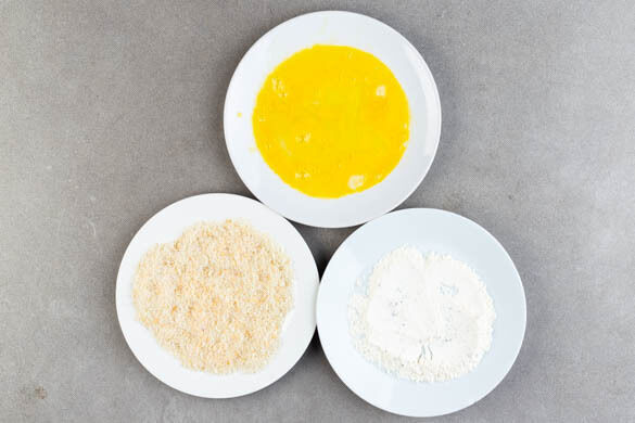 Das Fleisch inzwischen trocken tupfen, horizontal halbieren und großzügig mit Salz und Pfeffer würzen. 2EL Mehl auf einen Teller geben und mit je 1 kräftigen Prise Salz und Pfeffer vermengen. 1 Ei in einem tiefen Teller verquirlen, dann 1 Prise Salz unterrühren. Das Panko-Paniermehl auf einen dritten Teller geben.