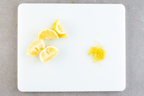 Die Zitronenschale fein abreiben, dann die Zitrone in Spalten schneiden.