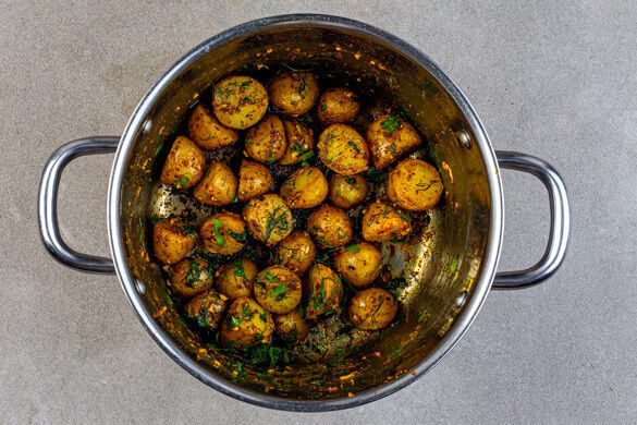 Die Kartoffeln samt Schale halbieren, in einen mittelgroßen Topf geben und mit kaltem Wasser bedecken. Das Wasser bei starker Hitze zum Kochen bringen, dann 1EL Salz hinzufügen und die Kartoffeln bei mittlerer Hitze 7–10Min. kochen, bis sie gar sind. In ein Sieb abgießen und etwas abkühlen lassen.