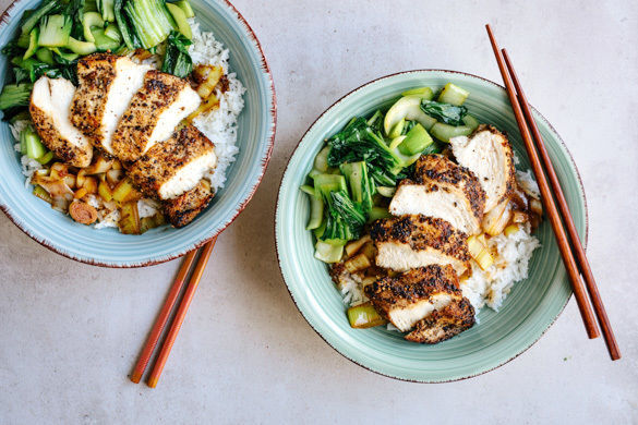 Das Fleisch in Tranchen schneiden und mit dem Lauch und dem Pak Choi auf dem Kokosreis anrichten. Nach Belieben mit mehr Pfeffer würzen und servieren.
