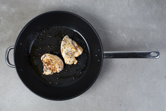 In einem mittelgroßen Topf 200ml leicht gesalzenes Wasser mit der Kokosmilch zum Kochen bringen. Den Knoblauch schälen, fein würfeln und mit 2EL Pflanzenöl, je 1 kräftigen Prise Salz und Zucker sowie 1TL Pfeffer verrühren (am besten frisch gemahlen). Das Fleisch trocken tupfen, jeweils halbieren und mit dem Würzöl einreiben.