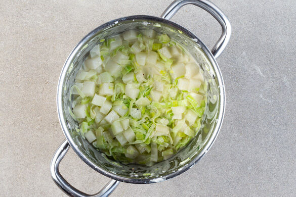 Den Kohlrabi in das kochende Wasser geben und ca. 2Min. kochen. Den Lauch dazugeben und ca. 1Min. im Wasser zusammenfallen lassen. Das Gemüse in ein Sieb abgießen, den Topf aufbewahren.