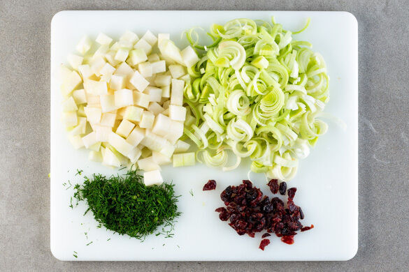 In einem zweiten mittelgroßen Topf ca. 500ml leicht gesalzenes Wasser zum Kochen bringen. Den Kohlrabi schälen und in ca. 1cm kleine Würfel schneiden. Den Lauch längs halbieren und quer in dünne Streifen schneiden. Den Dill samt Stängeln fein schneiden. Die Cranberrys grob hacken.