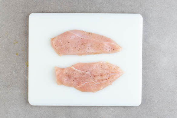 Das Fleisch trocken tupfen, jeweils horizontal halbieren und mit je 1 kräftigen Prise Salz und Pfeffer einreiben.