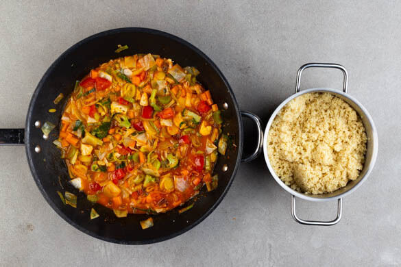 Den Gemüsemix in einer großen Pfanne mit 2EL Butter bei mittlerer bis starker Hitze 6–8Min. anbraten, bis der Lauch glasig wird. Die Tomaten, die Rosinen, die Harissa und das restliche Brühgewürz in die Pfanne rühren. 400ml Wasser angießen, aufkochen und die Sauce bei mittlerer Hitze 6–8Min. einköcheln lassen.
