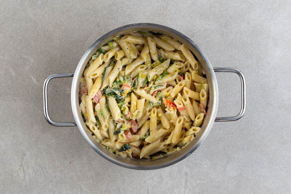 In einem mittelgroßen Topf ausreichend gesalzenes Wasser für die Pasta zum Kochen bringen. Die Pasta in das kochende Wasser geben und in 7–9Min. bissfest kochen. Mit einem Messbecher 100ml Pastawasser abschöpfen, dann die Pasta in ein Sieb abgießen und abtropfen lassen. Zurück in den Topf geben und abgedeckt warm halten.
