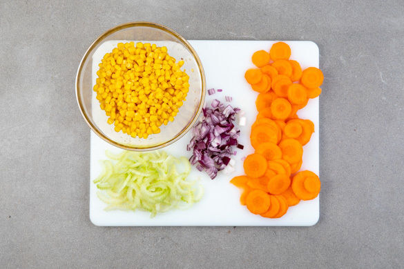 Den Backofen auf 180°C (160°C Umluft) vorheizen. Die Karotten ggf. schälen und in dünne Scheiben schneiden. Den Sellerie ebenfalls in dünne Scheiben schneiden. Die Zwiebel schälen, halbieren und fein würfeln. ⅔ des Maises in ein Sieb abgießen und abtropfen lassen. Der übrige Mais wird für dieses Rezept nicht benötigt.