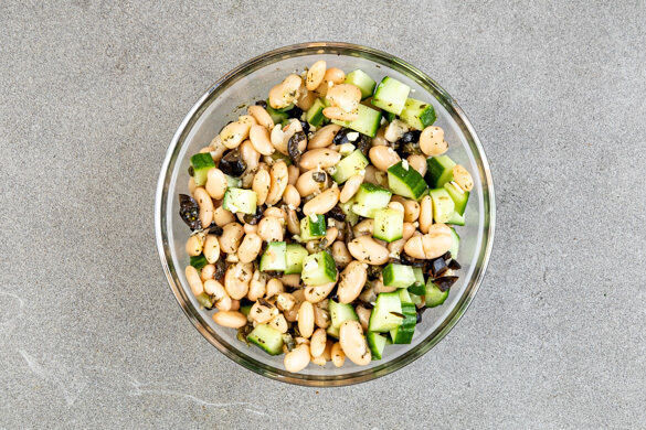 Mit einem Schneebesen 4EL Olivenöl, 2EL Essig, 2TL getrocknete Minze, 2TL Senf und 2TL Honig zu einem Dressing verrühren. Die Bohnen, den Knoblauch, die Oliven, die Kapern und die Gurke zugeben und gründlich unterheben.